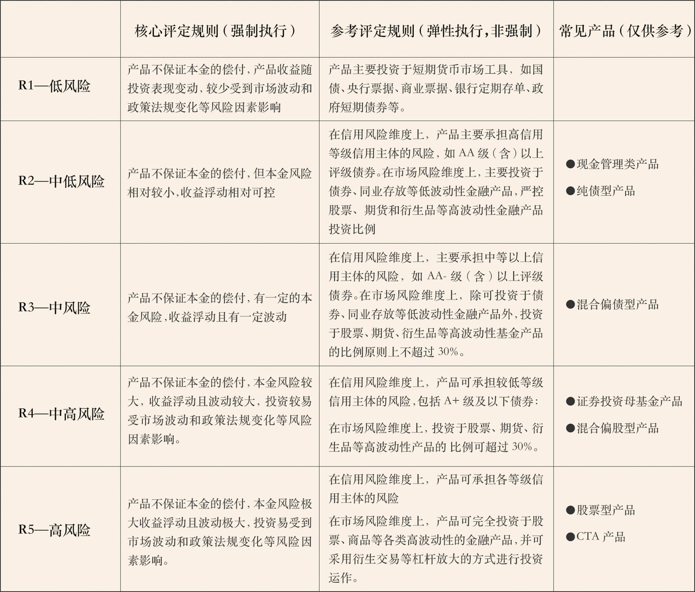 第四条【风险等级分类】基金产品风险评级结果应当以风险等级体现,由低到高至少包括一级至五级;根据实际情况,可以进一步细分。产品风险等级,由低到高分为R1(低风险)、R2(中低风险)、R3(中风险)、R4(中高风险)、R5(高风险)五个级别,